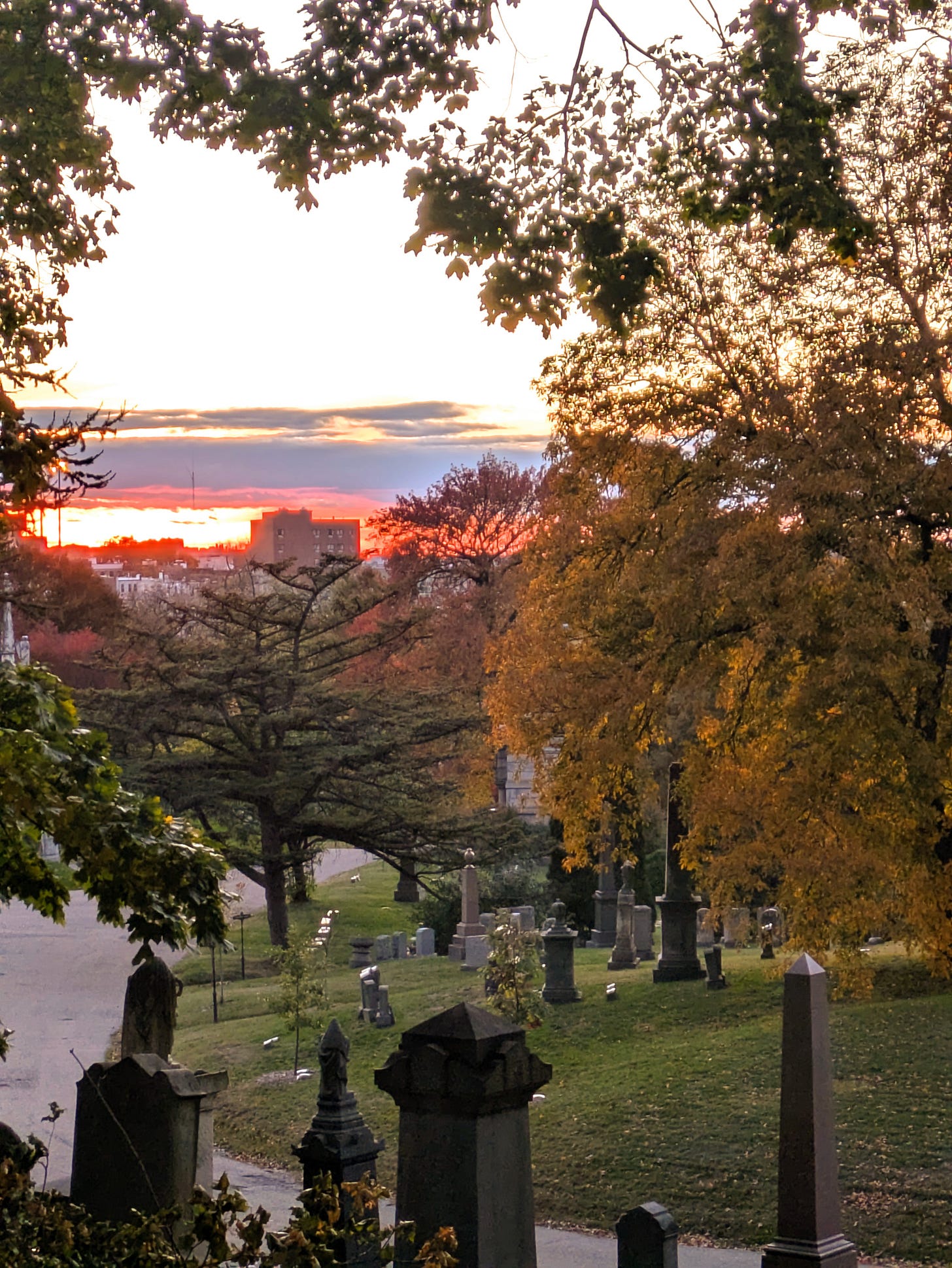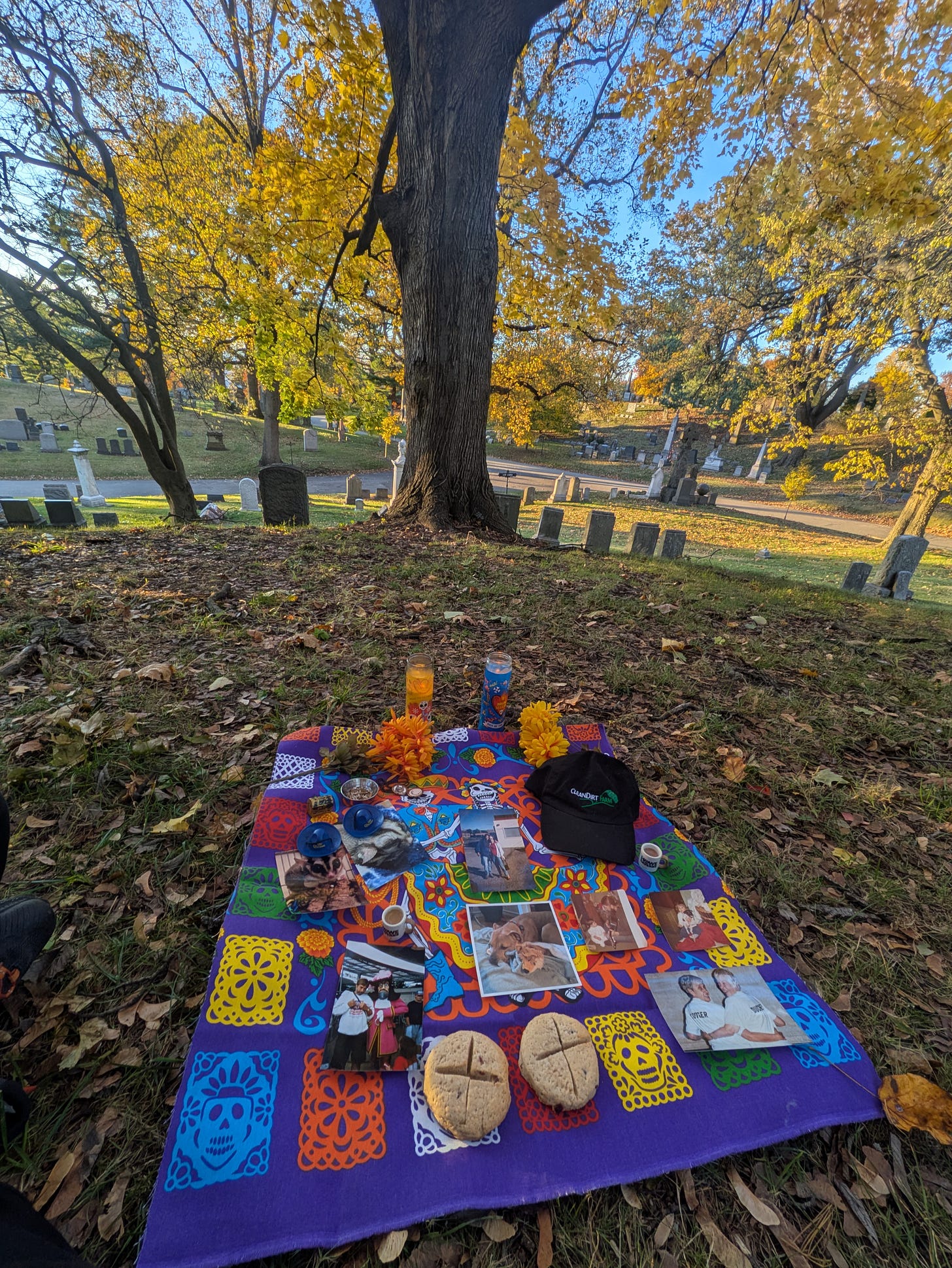 On Day of the Dead, my love and I went to a celebration at Green-wood Cemetery. We packed our own sack of remembrances and laid them out on a cloth beneath the arms of a golden Maple: candles, marigolds, pictures, artifacts, tiny mugs into which we poured coffee and tea, soul cakes I’d baked for us. We told a few stories but sat mostly in silence, this year a more somber celebration, watching the sky blush pink, grasping each other’s hands.